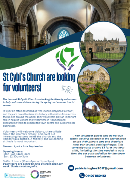 The team at St Cybi's Church are looking for friendly volunteers to help welcome visitors during the spring and summer tourist season.